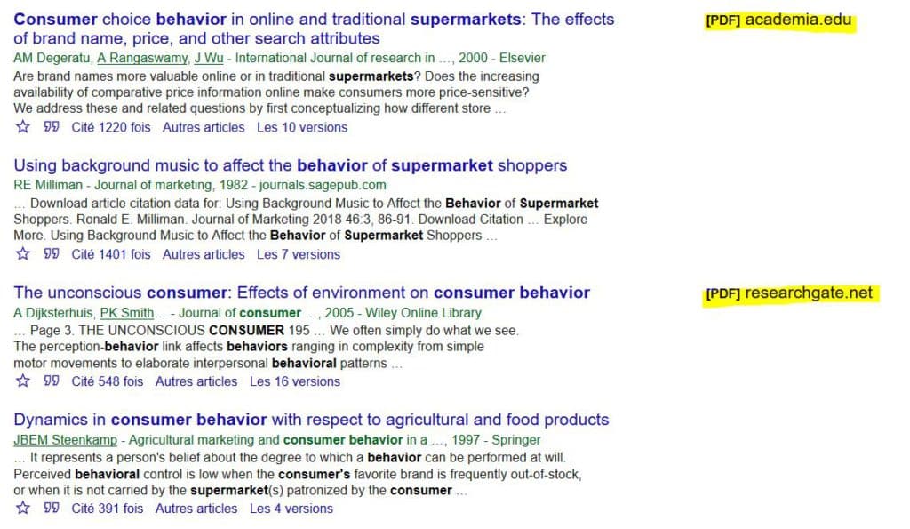 Ne baissez pas les bras. De plus en plus d’articles, notamment scientifiques, sont accessibles gratuitement : certains auteurs ou revues optent pour le label « CC » (Creative Commons). Pour maximiser les résultats, privilégiez les mots-clés en anglais sur Google Scholar. Par exemple, en cherchant « Supermarket for Consumer Behaviour » (152 000 résultats), vous trouverez des publications libres d’accès mises à disposition directement par leurs auteurs, parfois sur Academia. Ce site mérite vraiment le détour pour compléter votre veille.